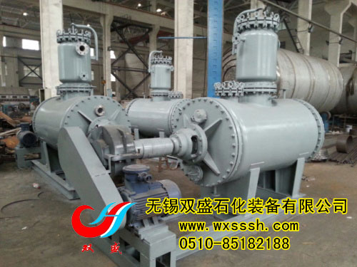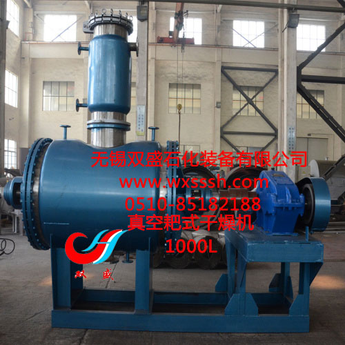 被干燥物料從殼體上方正中間加入,在不斷正反轉動的耙齒的攪拌下,物料軸向來回走動,與殼體內壁接觸的表面不斷更新,受到蒸汽的間接加熱,耙齒的均勻攪拌,粉碎棒的粉碎,使物料內的水份氣化,在真空系統的作用下,使被干燥物料內部水份和表面水份更有利的排出,氣化的水份經干式除塵器、濕式除塵器、冷凝器,從真空泵出口處放空。